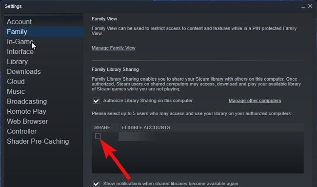 Bước 6: Cho phép chia sẻ thư viện game với tài khoản khác