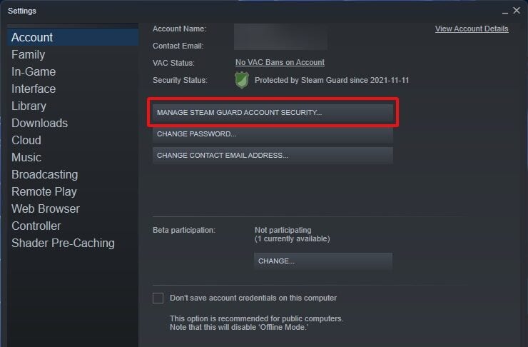 Bước 2: Trong cửa sổ Settings, chọn mục Manage Steam Guard Account Security.