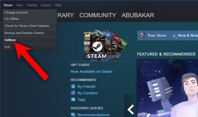 Bước 1: Trong Steam, vào lại Steam > Settings.